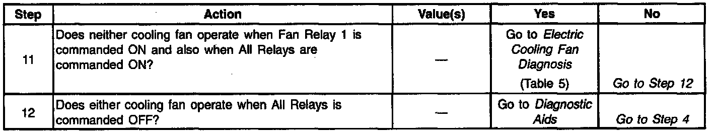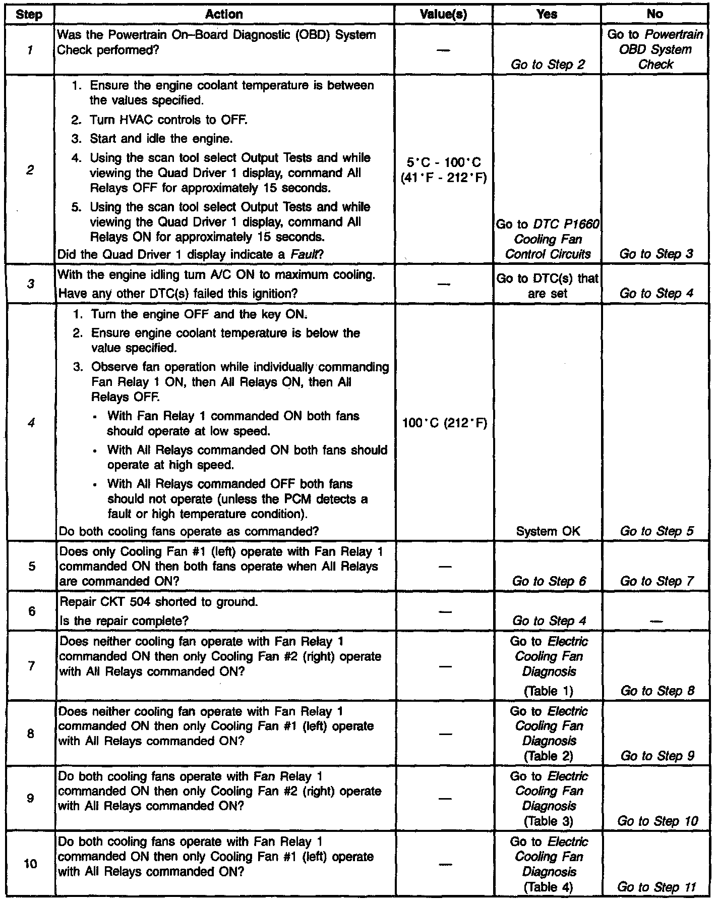 ^ If the cooling fans operate when commanded OFF and DTC P1660 is not set either a cooling fan relay is stuck ON or a cooling fan circuit is shorted to power.