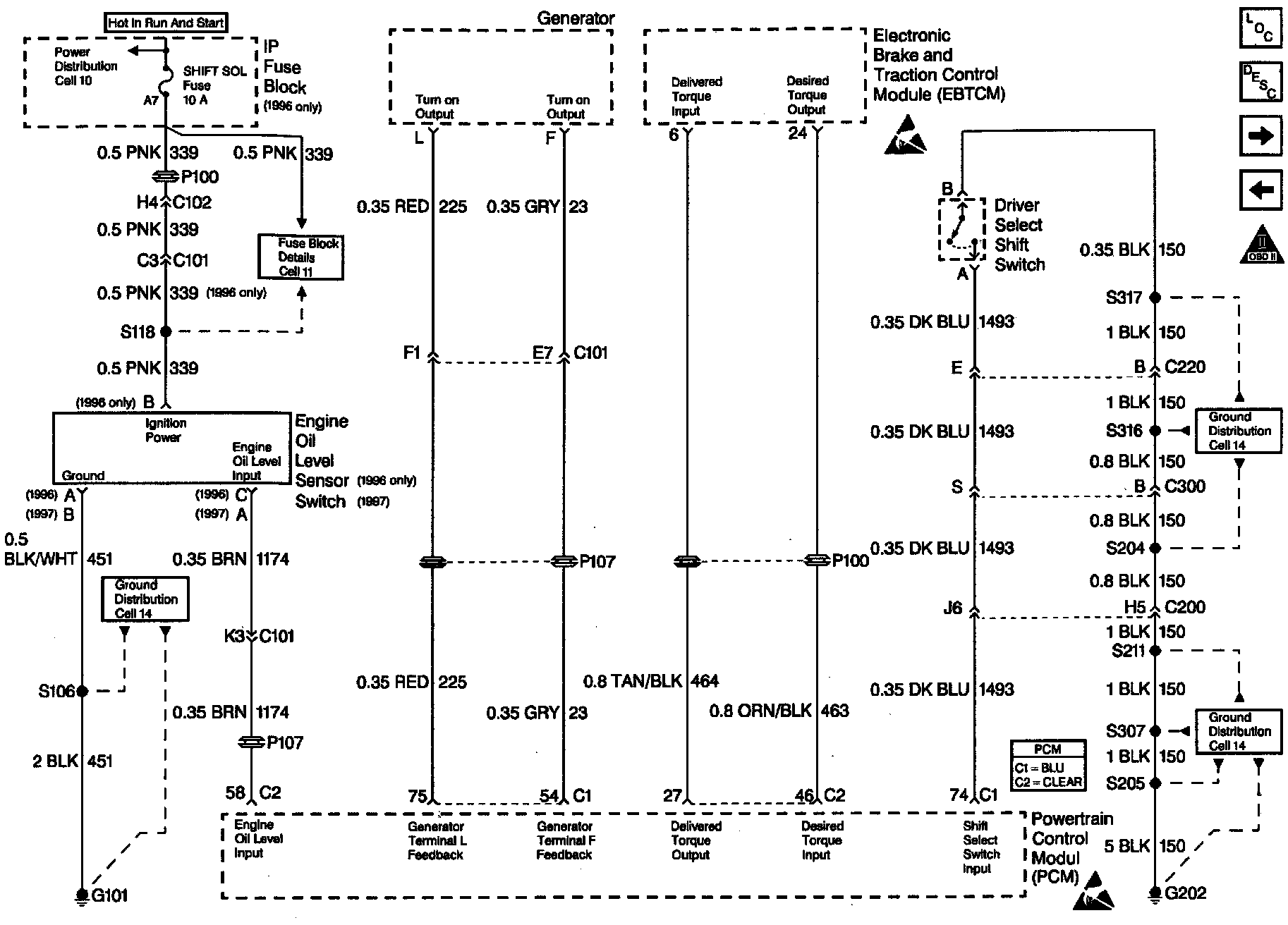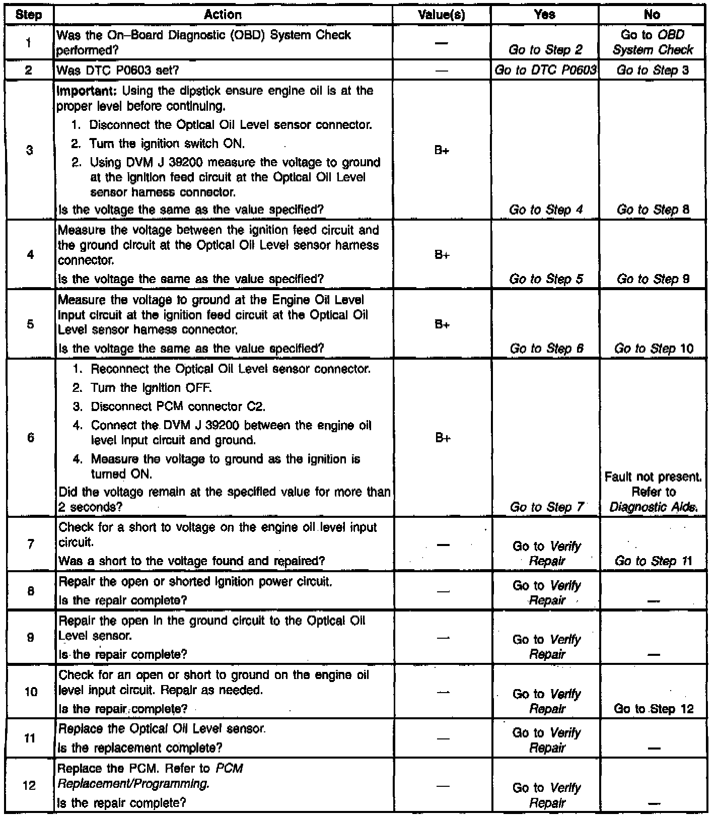 This vehicle is equipped with an Optical Oil Level sensor to detect a low oil level condition. The sensor is powered through CKT 339 and grounded through CKT 451. The oil level input is CKT 1174 to PCM connector C2 terminal 58. The input is normally low voltage to the PCM that switches high for 1 second after ignition ON to check for system faults. Normal operation of the sensor is a low to high to low voltage system check, then, if the sensor remains low, a low oil level is indicated, if after approximately 10 seconds the signal goes high, a normal oil level is indicated. A system fault will be detected if the PCM never detects the low to high to low pulse, circuit voltage always high or always low.