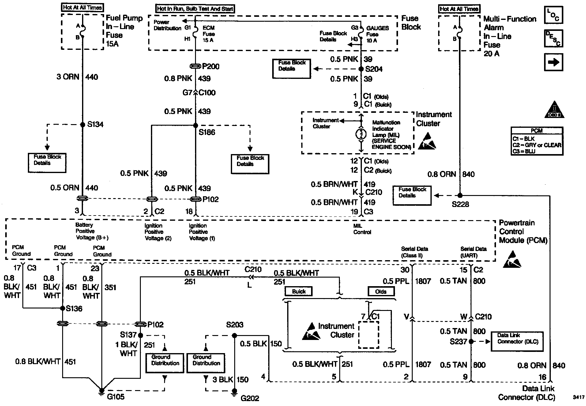 Battery power and ground is supplied for the scan tool through the DLC. The Class 2 serial data circuit to the DLC allows the PCM to communicate with the scan tool. A Universal Asynchronous Receiver Transmitter (UART) serial data line is used to communicate with other modules such as the Electronic Brake Control Module (EBCM), the Supplemental Inflatable Restraint (SIR) system and the Instrument Panel Cluster (IPC).