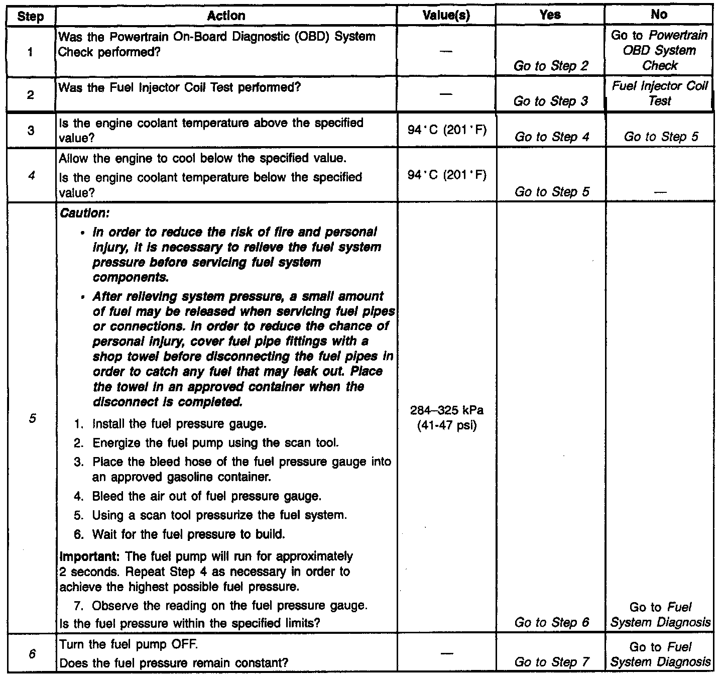 6. The fuel pressure should reach a steady value. If the fuel pressure does not reach a steady value, refer to Fuel System Diagnosis. System Diagnosis - Fuel System
