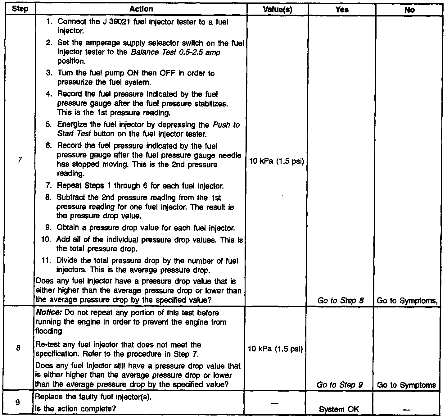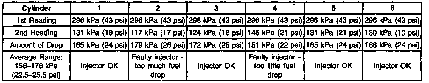 7. If the pressure drop value for each fuel injector is within 10 kPa (1.5 psi) of the average pressure drop value, the fuel injectors are flowing properly. Calculate the pressure drop value for each fuel injector by subtracting the second pressure reading from the first pressure reading. Refer to the illustration above.