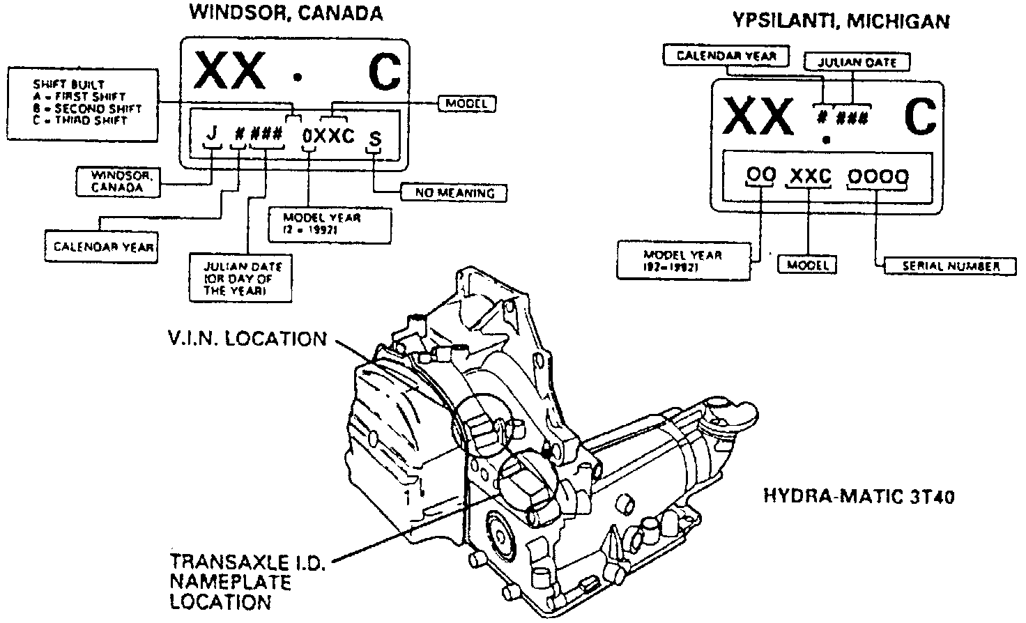 These transaxles may be identified by a model tag attached to the oil pan flange pad to the right of the oil dipstick at the rear of the transaxle.