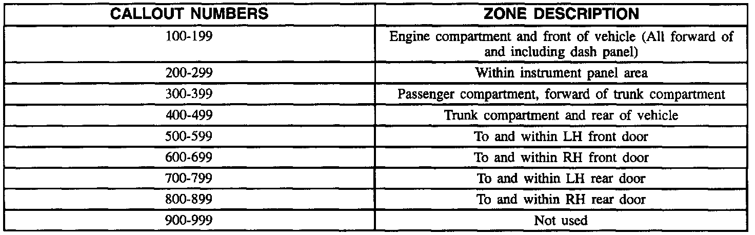 All grounds, in-line connectors, pass-through grommets and splices are given identifying numbers according to where they are located in the vehicle. The above chart explain the numbering system.