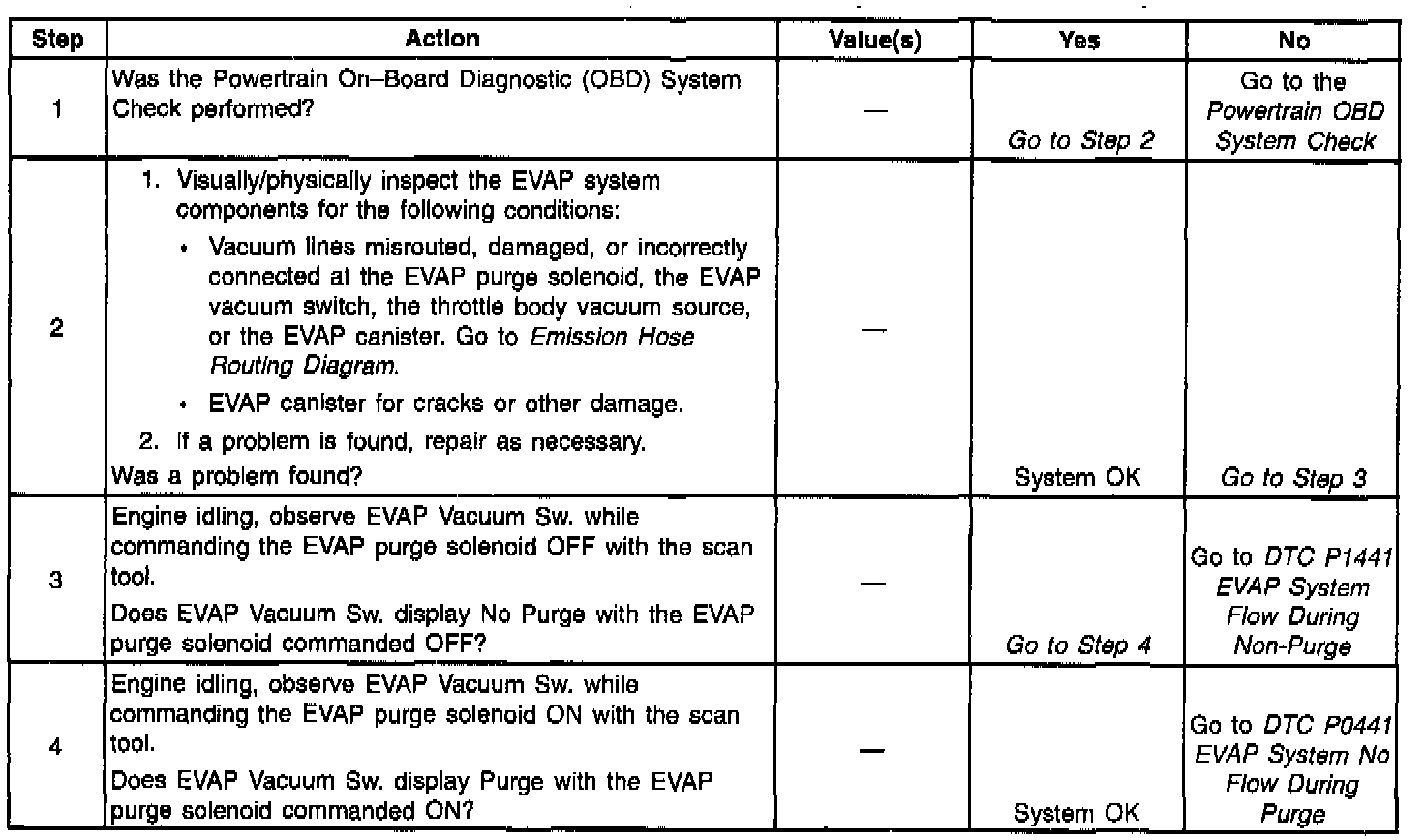 The EVAP purge vacuum switch is a normally closed switch positioned in the purge line between the canister and the EVAP purge solenoid. The EVAP purge vacuum switch will open when vacuum increases to greater than 5 inches of water in the purge line. The PCM monitors the EVAP purge vacuum switch signal to determine of the evaporative emission control system is working properly. If the switch is closed (no purge flow) when the PCM is commanding the EVAP purge solenoid ON, DTC P0441 should be set. If the switch is open (purge flow detected) when the PCM is not commanding the EVAP purge solenoid ON, DTC P1441 should be set. If the switch is open when sufficient vacuum should not be present, DTC P1442 should be set. Refer to the DTC charts for further diagnostic procedures regarding the EVAP system. Testing and Inspection