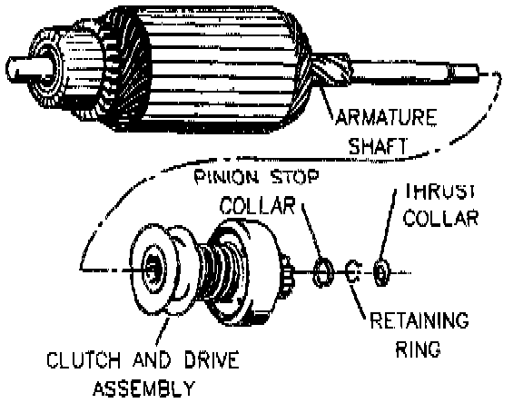 8. Thrust collar from armature shaft, then snap pinion stop collar off of retainer ring. Collar will remain on shaft next to drive pinion.