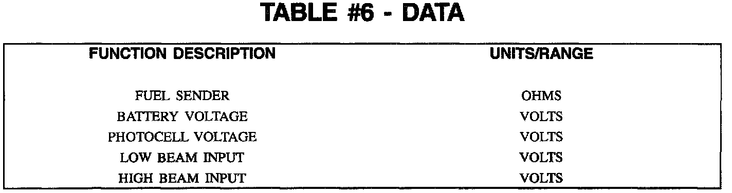 In this mode of operation, the scan tool can command the Body Function Controller (BFC) to read its various analog data inputs. This mode can be used to determine whether the BFC is receiving analog data correctly or if a component is operating properly. The inputs that can be read are listed on TABLE #6 shown in the above figure.