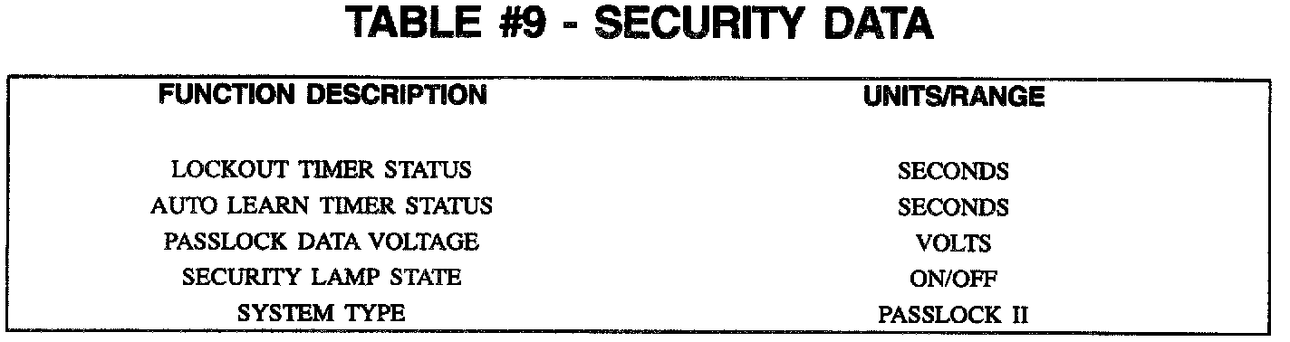In this mode of operation, the scan tool reads the Vehicle Theft Deterrent data in the Body Function Controller