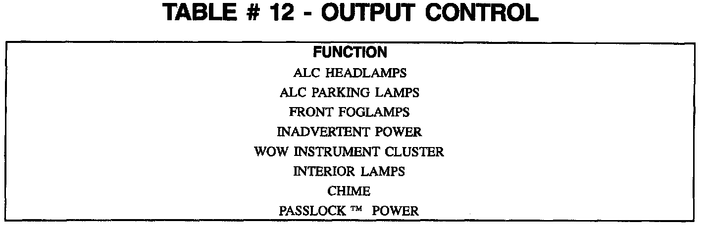 In this mode of operation the technician is capable of turning on and off almost all of the Body Function Controller (BFC) outputs. The functions that can be controlled are found under the Output Control menu. The information in TABLE #12 shows what outputs the scan tool can command.