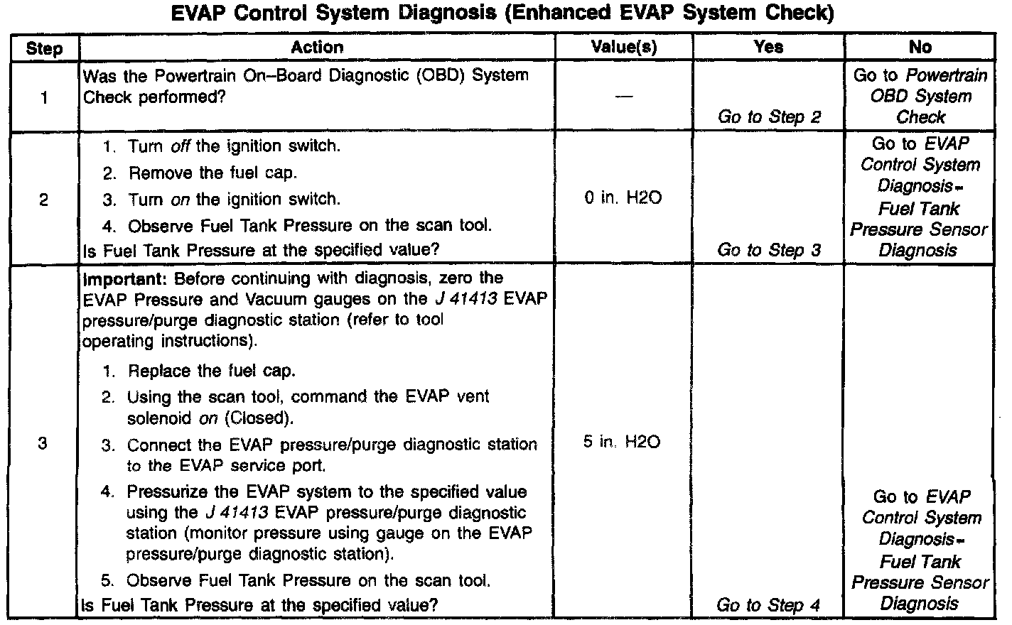 6. The PCM commands the EVAP purge solenoid off (open) and the vent solenoid on (closed) with the scan tool System Perf. EVAP output control function activated. Engine vacuum should cause fuel tank pressure to decrease when System Pert. is activated.