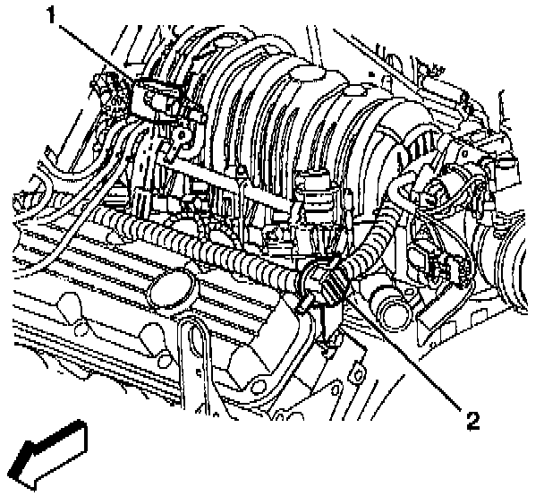 1. Disconnect the electrical connector and the vacuum hoses from the EVAP vacuum switch (2).