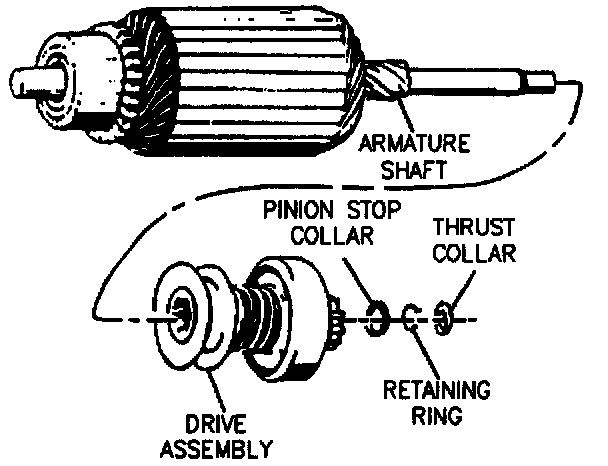 2. Test assembly drive action. The pinion should turn freely in the overrunning direction. check pinion teeth to see that they have not been chipped, cracked, or excessively worn. Replace assembly when necessary. Badly chipped pinion teeth can indicate chipped ring gear teeth, which should he replaced when necessary.
