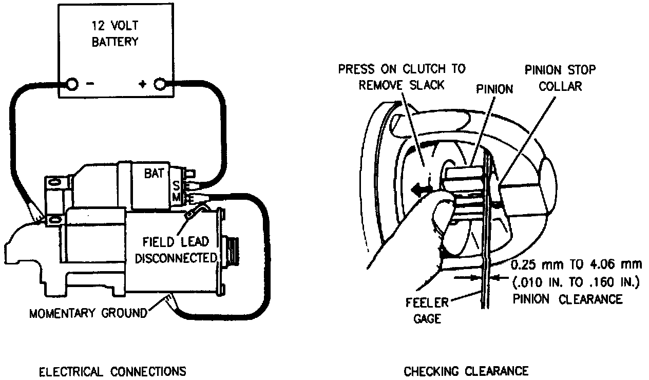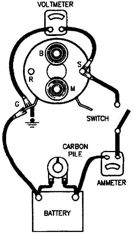 ^ To check hold-in winding, connect an ammeter and switch in series with a 12-volt battery and the "S" terminal on the solenoid. Connect a voltmeter to the "S" terminal and to ground. Connect carbon pile across battery. Adjust the voltage to 10 volts and note the ammeter reading. Refer to Figure above.