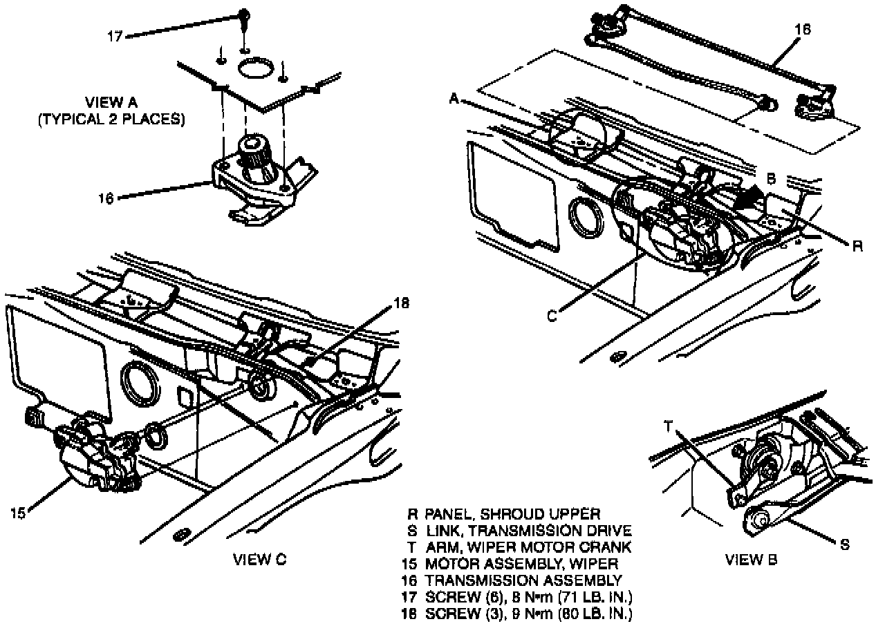 4. Transmission drive link (5) socket to wiper motor crank arm (T) ball using J 39529. Be sure socket is fully seated on ball.