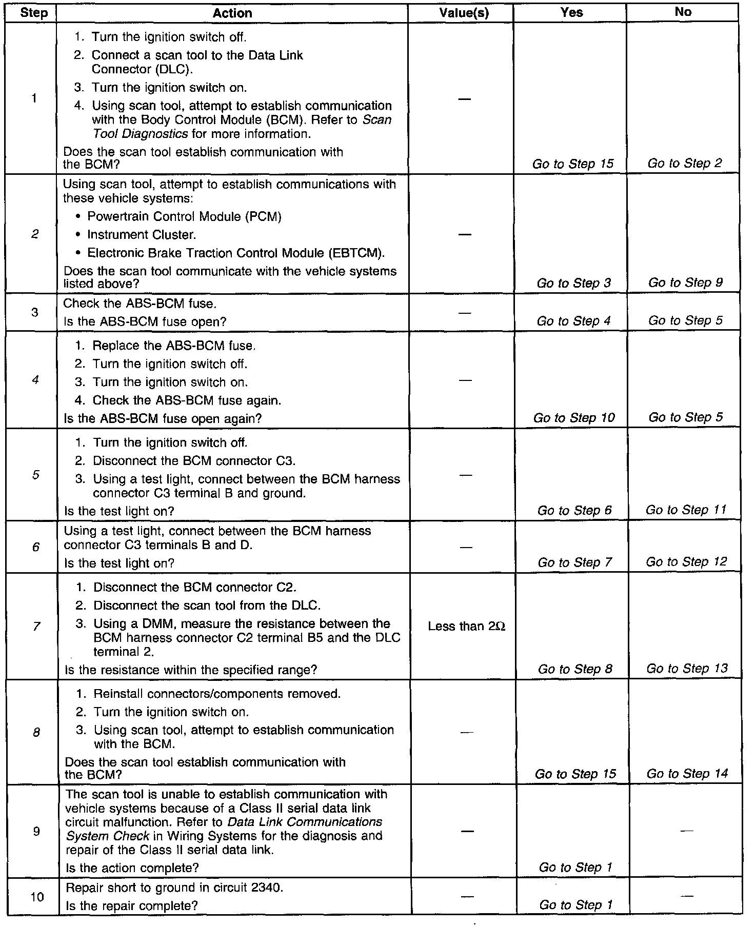 2. Determines whether the Class II serial data link has a circuit malfunction or the BCM is not communicating with the scan tool.