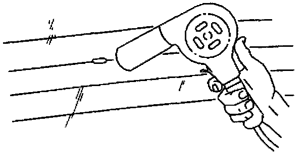 ^ Using a heat gun, with the nozzle held 25 mm (1 inch) from surface, heat the repair area for 2 to 3 minutes.