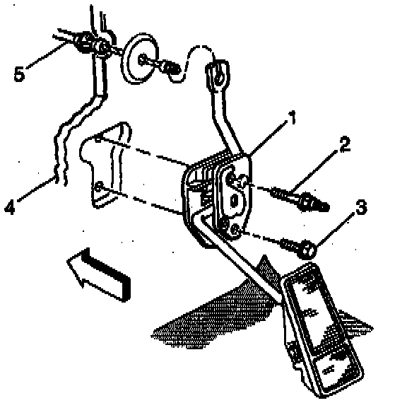 3. Remove the accelerator cable (5) from accelerator pedal (1).