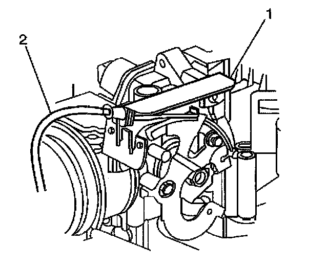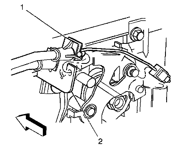 7. Remove the cruise control cable (1) from the accelerator controls bracket (2).