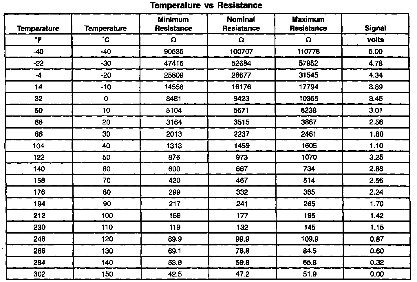 Temperature Vs Resistance Table: