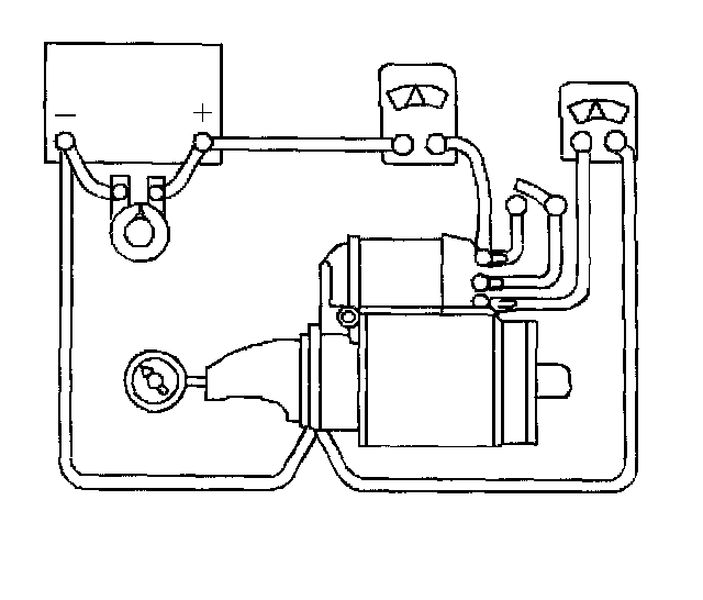 2. Connect the starter motor and an ammeter in series, between the positive terminal of a fully charged 12 V battery and the bolt terminal of the starter solenoid.