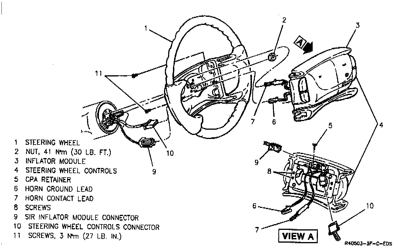 WARNING: When carrying a live inflator module, make sure bag and trim cover are pointed away from body. Never carry the Inflator module by wires or connector on underside of module. In case of an accidental deployment, bag will then deploy with minimal chance of injury. When placing a live inflator module on a bench or other surface, always face the bag and trim cover away from surface. Never rest a steering column on the steering wheel with inflator module face down and column vertical. This is necessary so that a free space is provided to allow air bag to expand in the unlikely event of accidental deployment. Otherwise personal injury may result.