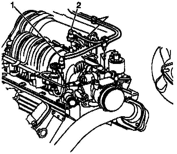 7. Install the fuel feed (2) and return (1) pipes to the fuel rail. Refer to Fuel Line Coupler, Service and Repair, Quick Connect Fitting(s) Service (Plastic Collar).