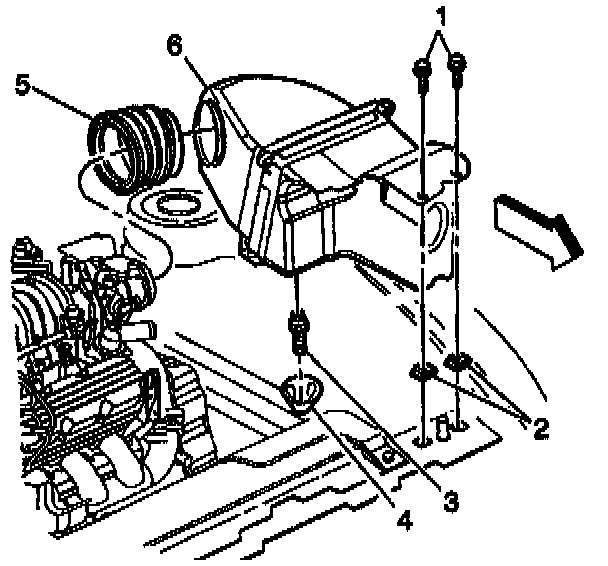 8. Pivot the air cleaner (6) and intake air duct (5) assembly toward the front of the vehicle.