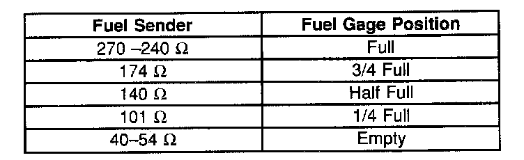 The instrument cluster drives the fuel gage pointer. Refer to the following table for the fuel sender ohm value to the fuel gage (pointer) position ratio: