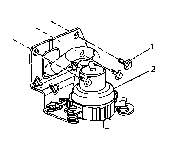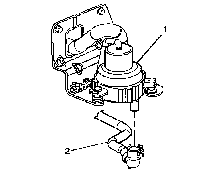 1. Attach the AIR pump and bracket assembly (2) the frame rail using the 3 attaching bolts (1)