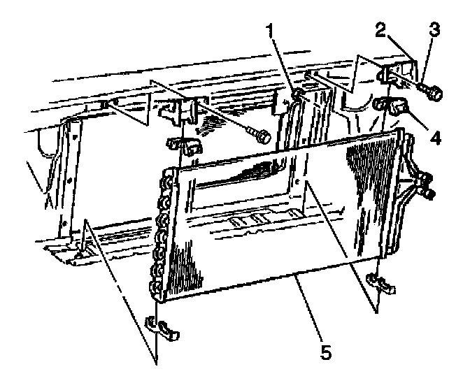 1. Install the condenser (5) into position by tilting the radiator toward the engine.
