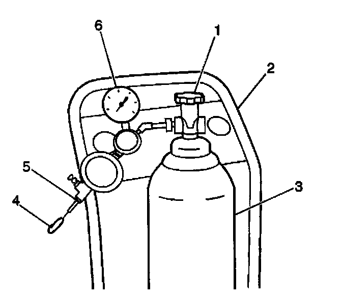 9. Disconnect the black hose (4) that connects the nitrogen cylinder to the cart J 41413 at the pressure regulator (5).