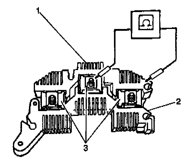 4.1.2. There should be continuity in one direction between each of the 3 phase clips (1) and the positive heat sink (2). When the polarity of the digital multimeter is reversed, all 3 readings should show open circuits.