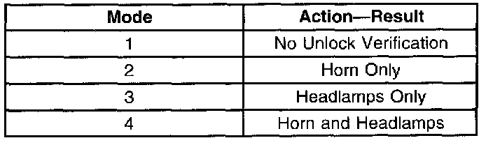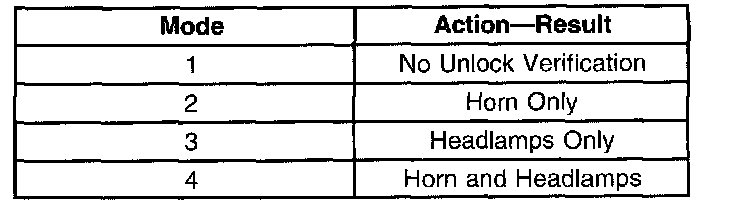 A remote unlock message received by the remote control door lock receiver will cause the Body Control Module (BCM) to command certain functions depending on the remote unlock verification mode. The (BCM) has four modes of operation for the remote unlock verification.