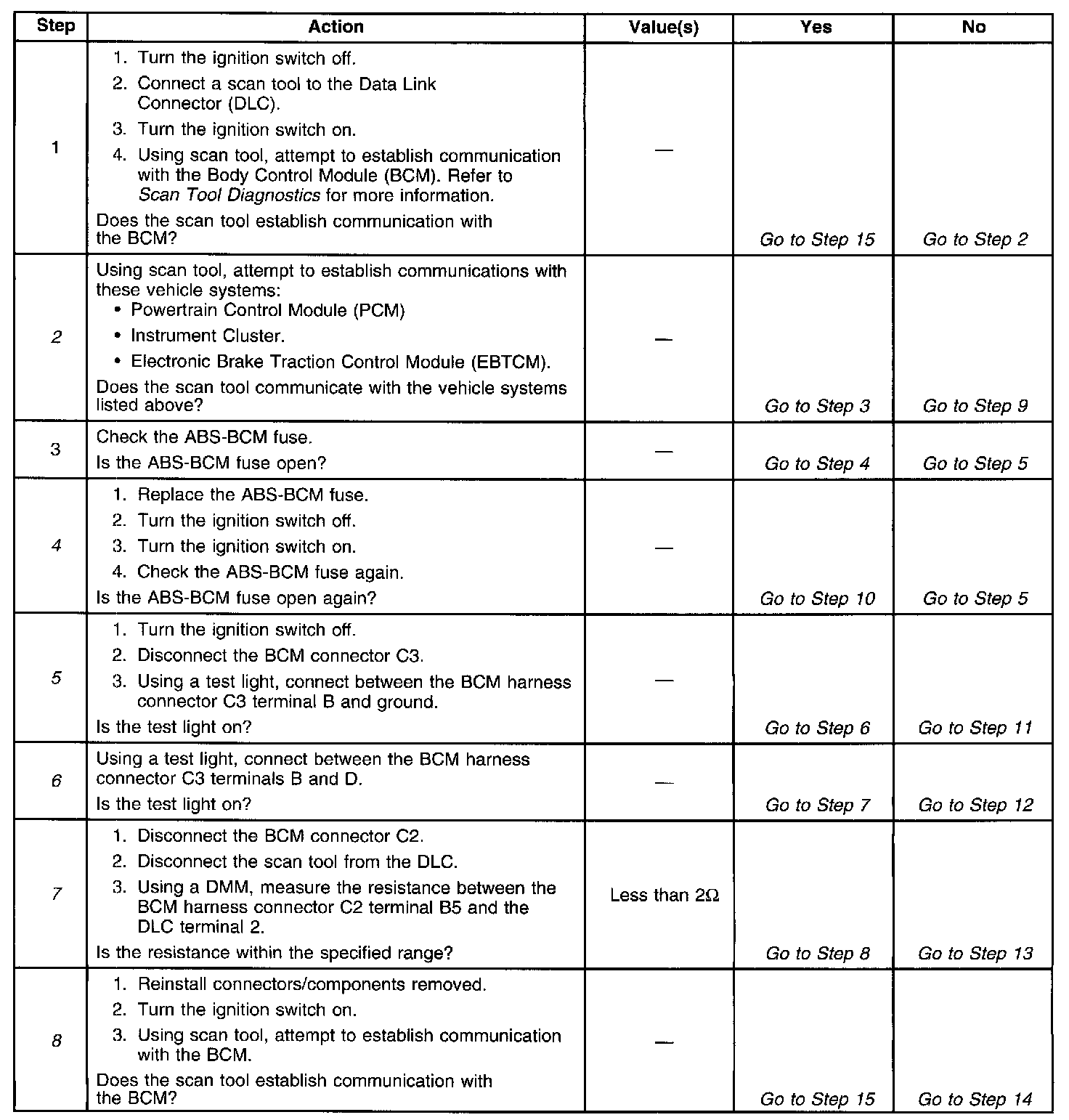 The Body Control Module (BCM) diagnostic system check is an organized approach to identify problems associated with the BCM. The BCM diagnostic system check must be the starting point for any BCM-related complaint. The BCM diagnostic system check will direct you to the next logical step in diagnosing the complaint. The BCM is a very reliable component and it is not likely the cause of the malfunction. Most BCM system malfunctions are linked to faulty wiring, connectors, and occasionally to other vehicle components. Understanding the BCM and using the diagnostic tables correctly will reduce diagnostic time and prevent unnecessary parts replacement.