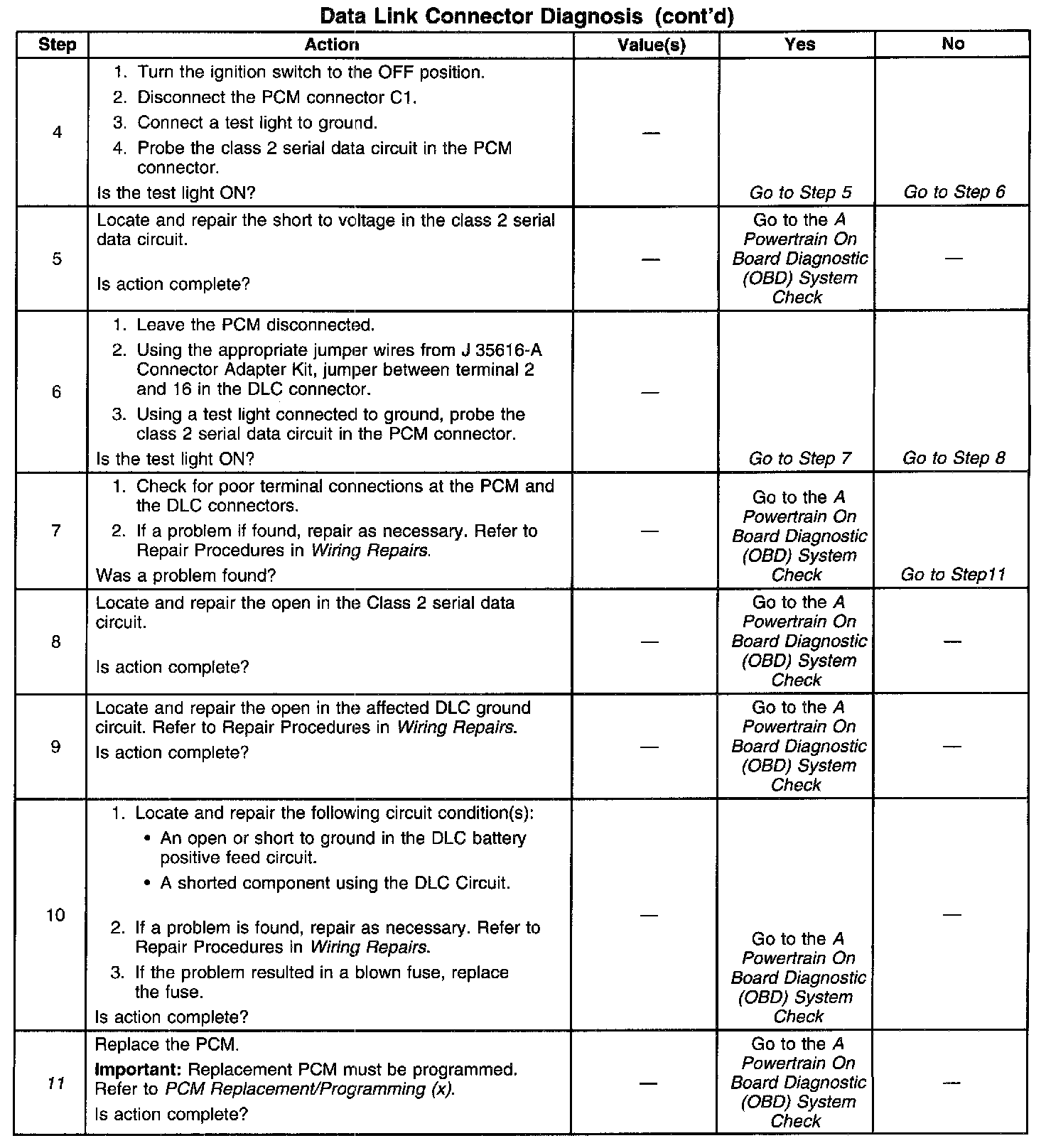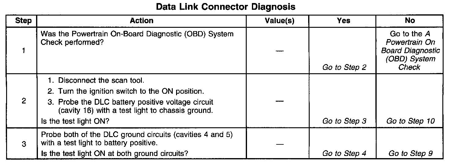 The Data Link Connector (DLC) allows the scan tool to interface with the PCM. The DLC provides the power and ground circuits to enable the scan tool. The Class 2 serial data circuit to the DLC allows bi-directional communication between the PCM and the scan tool. If communication between the scan tool and the PCM cannot be established, the procedure in the DLC Diagnosis table should be used to diagnose the condition.