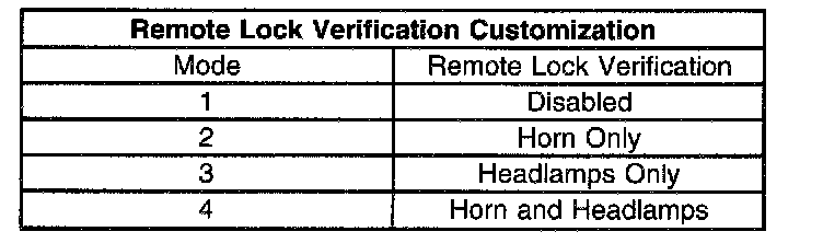 The chime will bong one to four times, equal to the current customization mode, to indicate which mode the vehicle is in. Each additional time the transmitter LOCK button is pressed, the mode number will advance. A transition past mode four will repeat starting again at mode one.