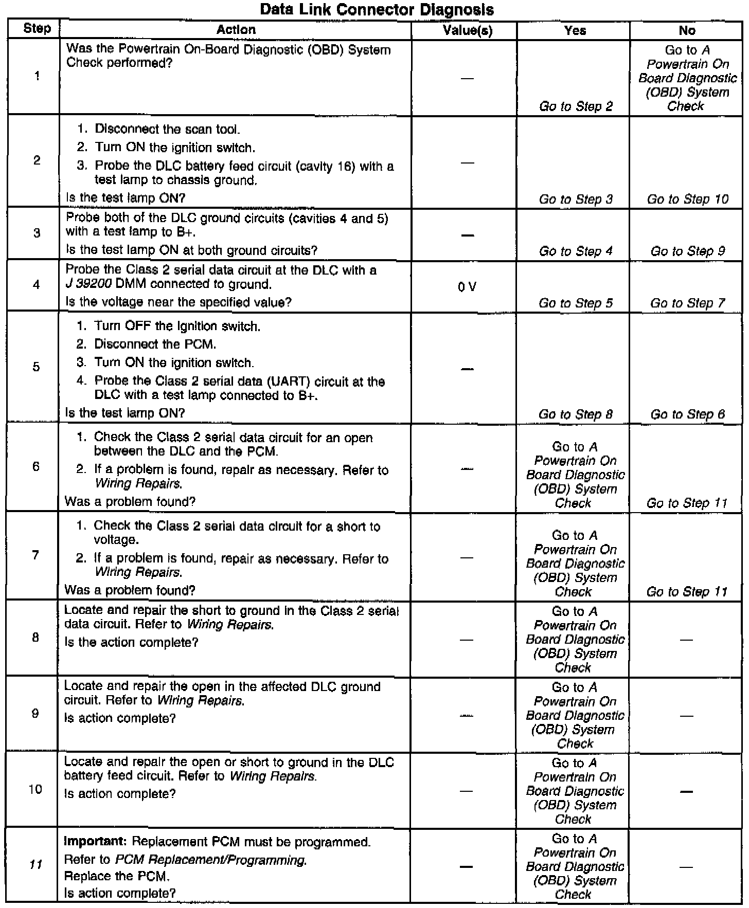 The Glass 2 serial data circuit to the DLC allows bi-directional communication between the PCM and the scan tool. If communication between the scan tool and the PCM cannot be established, the procedure in the DLC Diagnosis table should be used to diagnose the condition.
