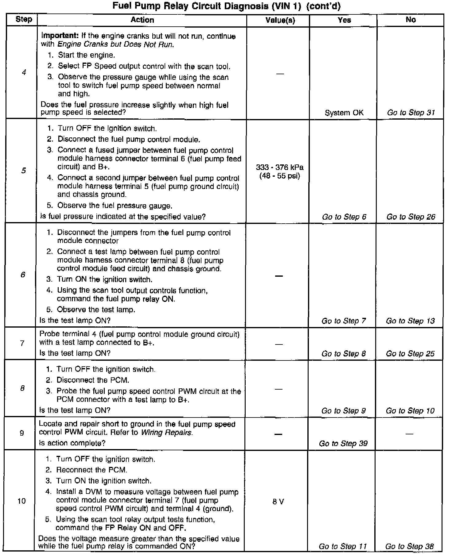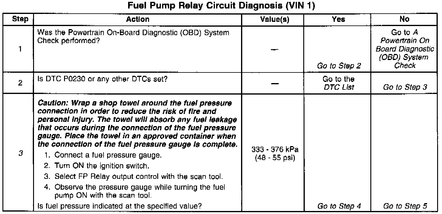 3. Fuel pressure between the specified values is sufficient for the vehicle to start. If directed to this table from the Engine Cranks But Will Not Run table, continue diagnosis with Engine Cranks But Will Not Run.