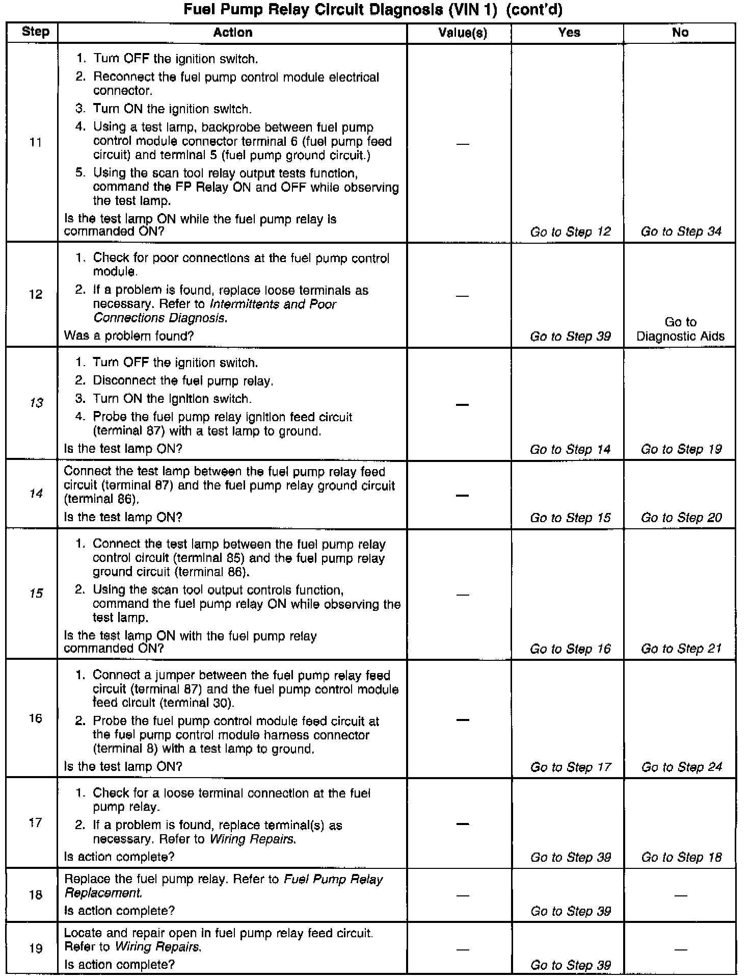 14. Checks the ground circuit for the fuel pump relay coil.
