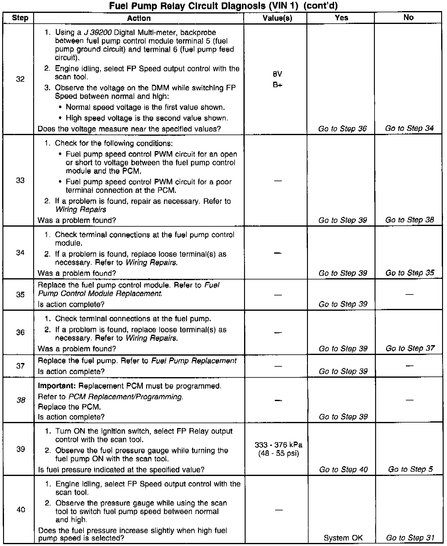 26. If the fuel pump is operating but incorrect pressure is observed, the fuel pump wiring is OK and the Fuel System Pressure Test should be used for diagnosis.