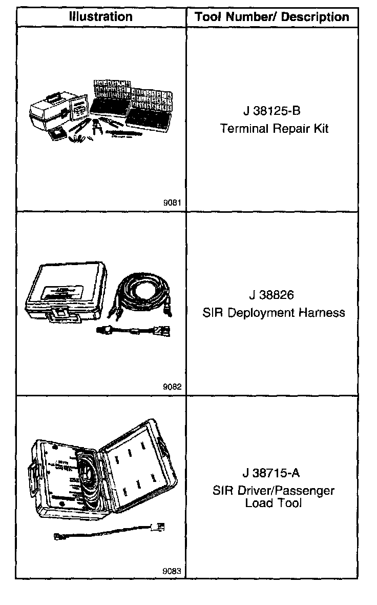 Use the J 38125-B Terminal Repair Kit for SIR wiring repair. This kit contains a special crimping tool, heat torch, and sealed splices. Do not use the terminals in the kit in order to replace damaged SIR system terminals unless specifically indicated by the terminal package.