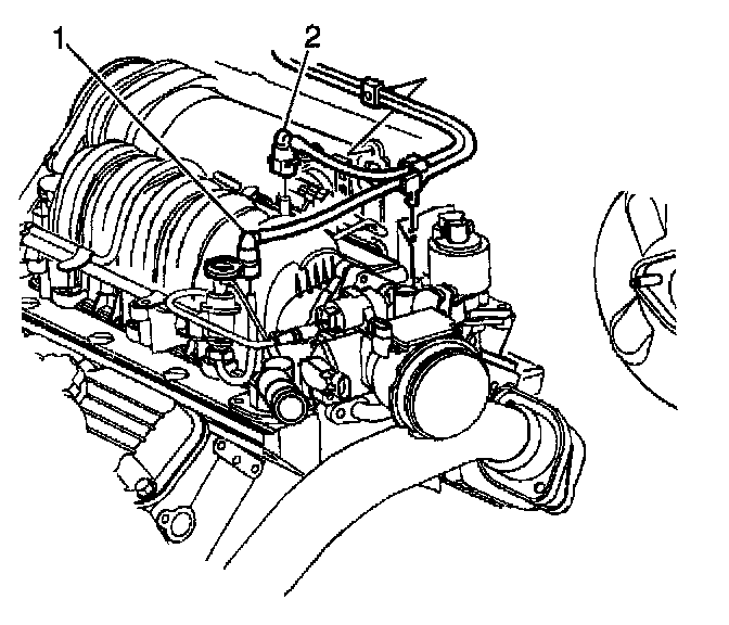 7. Install the fuel feed (2) and return (1) pipes to the fuel rail.