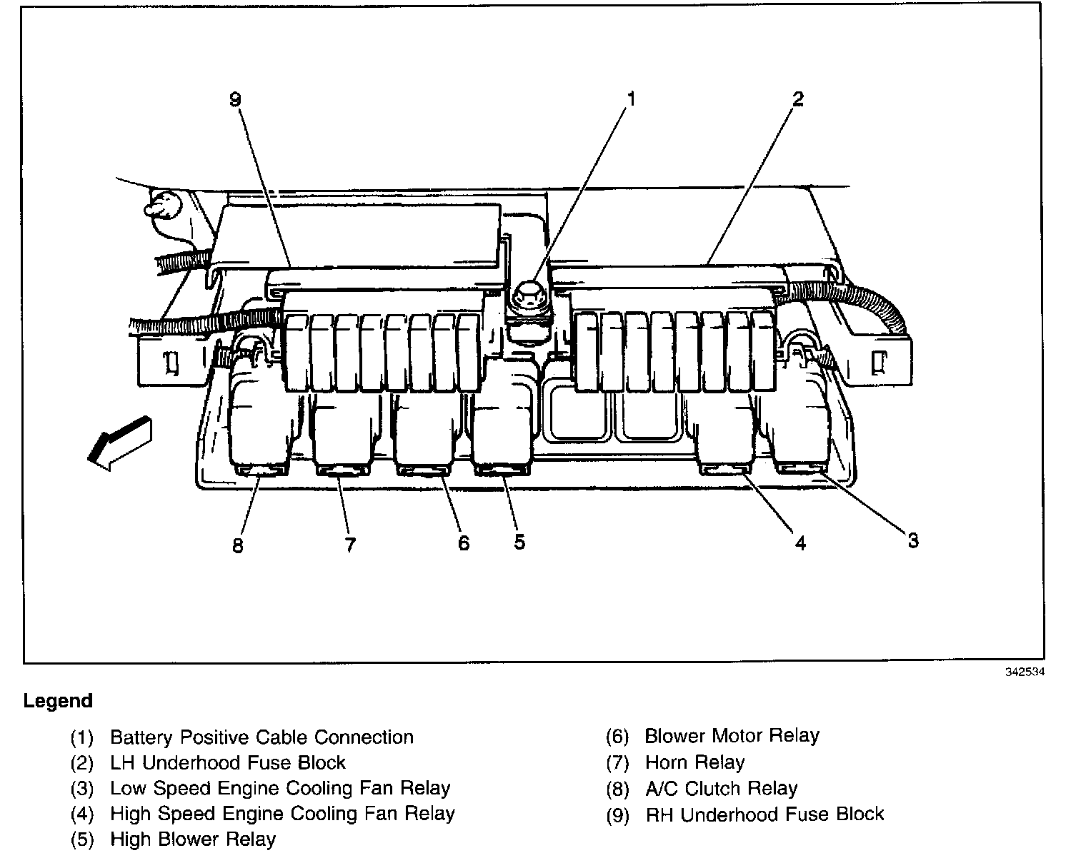 In the center rear of the engine compartment below the right side MaxiFuse(R) block