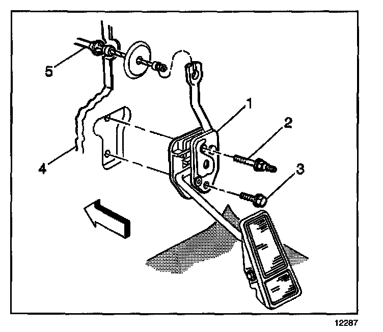 2. Remove the accelerator controls cable (5) from accelerator controls pedal (1).