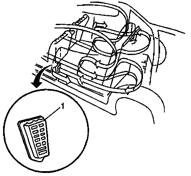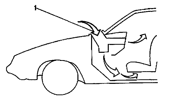 This vehicle has a flow-through ventilation system. A supply of outside air flows into the vehicle when the blower motor runs. While the side windows are closed, some air will follow the following path:1. Into the cowl air inlet grille (1)