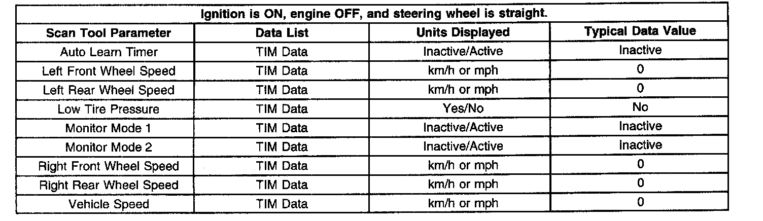 Low Tire Pressure: Scan tool displays: Yes/No -Display indicates if the TIM status; whether or not the tires should be checked for proper air pressure.