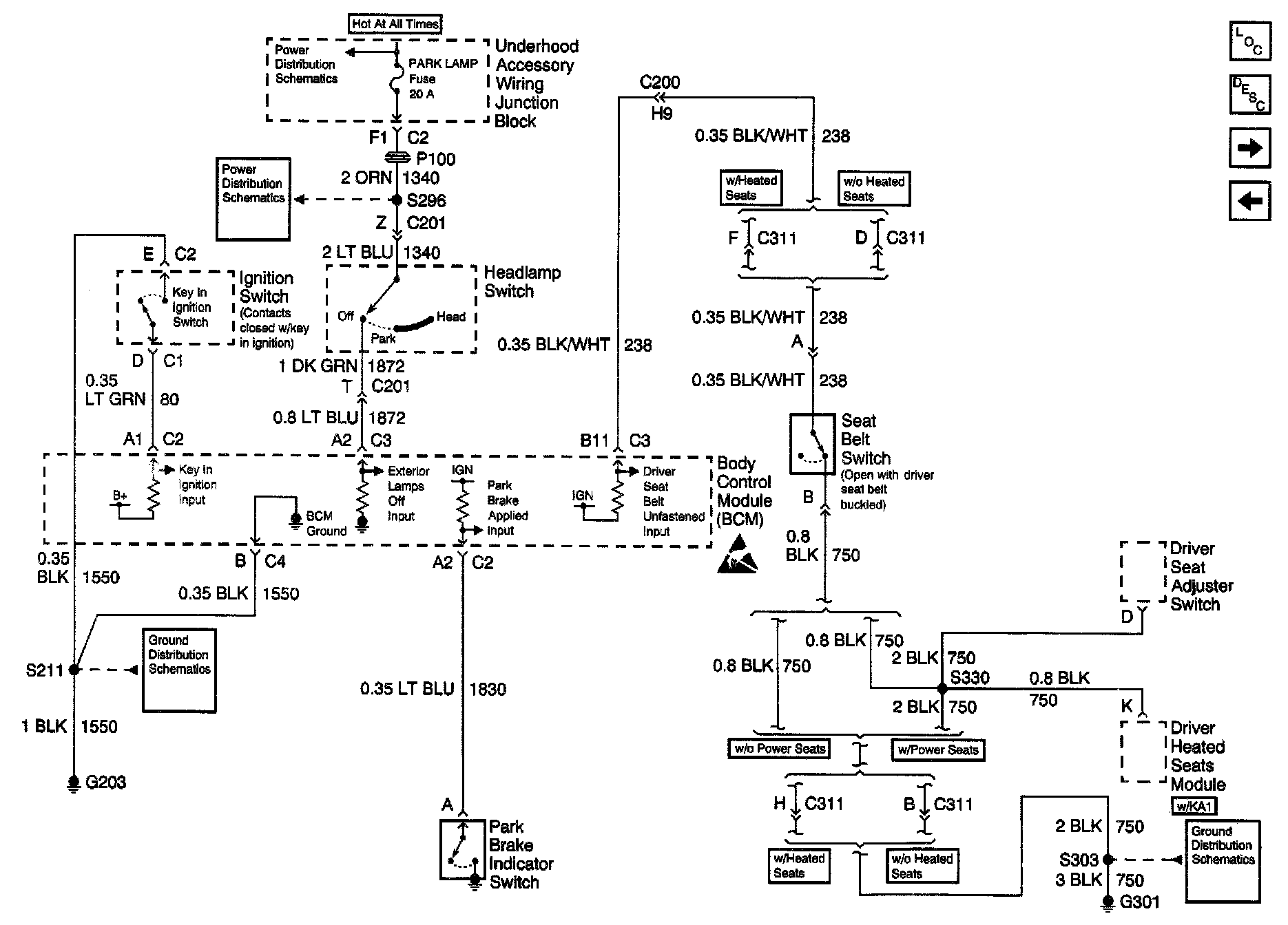 Body Control Module Schematics: Ignition Switch, Headlamp Switch, Park Brake Switch, Seat Belt Switch And Driver Seat Adjuster Switch:
