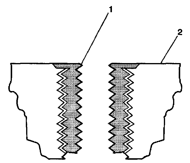 A properly installed insert (1) will be either flush or slightly below flush with the surface of the base material (2).