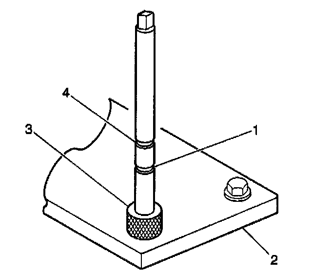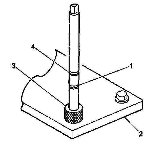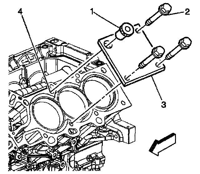 2. Install the fixture plate (3), bolts (2), and bushing (1) onto the engine block deck. Position the fixture plate and bushing over the hole that is to be repaired (4).