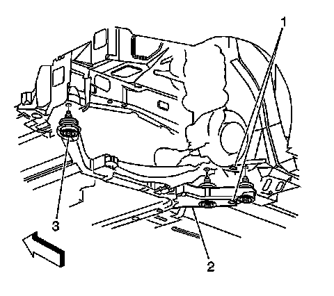 3. Install the engine frame insulator fasteners (3) to secure the engine frame (2) to the vehicle.