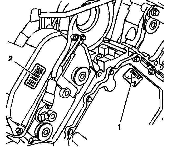 The engine front cover has an engine verification label (1) and the front of the right camshaft cover has a traceability label (2).